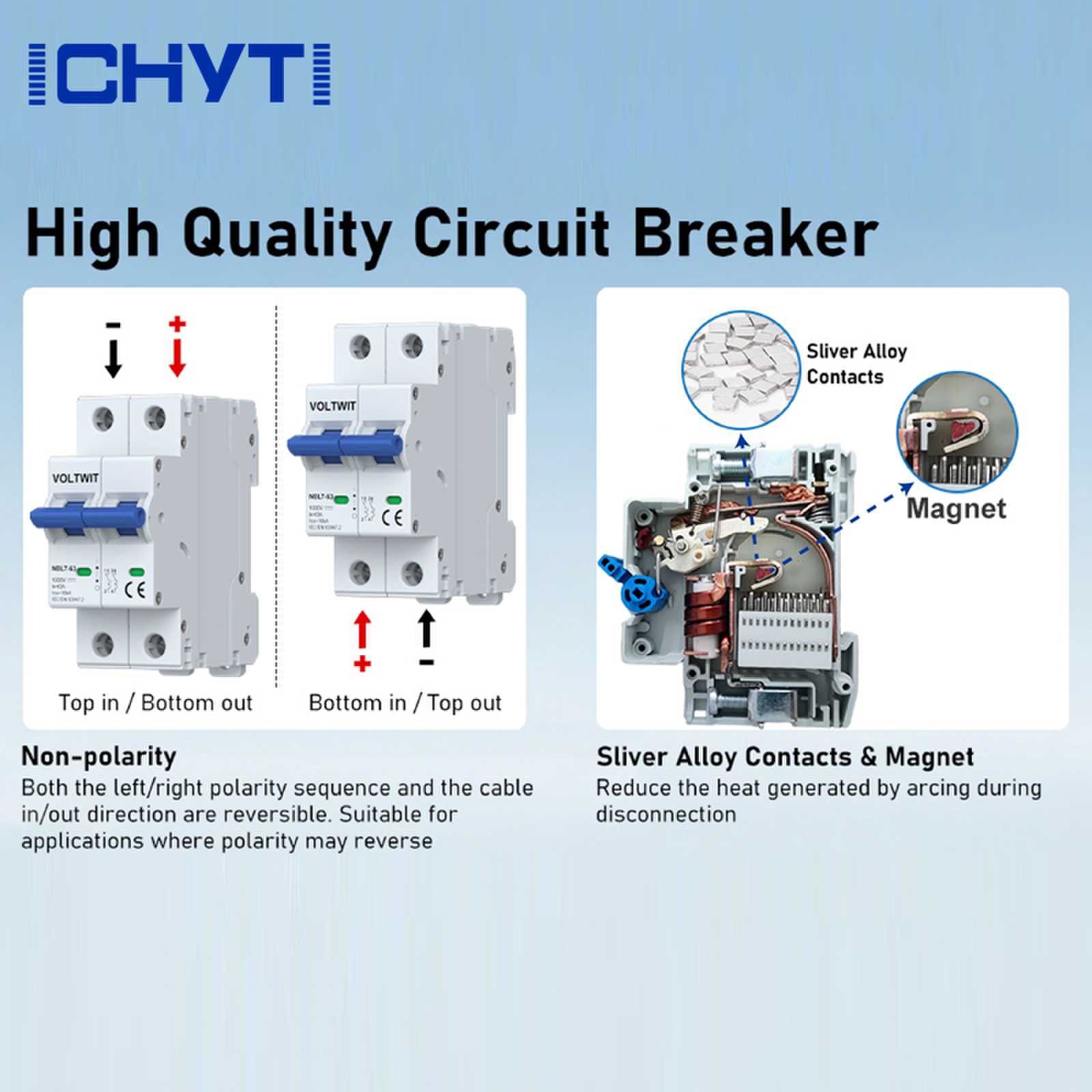 Chyt चायना डीसी ब्रेकर स्विचचा एक कुशल निर्माता आणि पुरवठादार आहे. तुम्ही परवडणाऱ्या किमतीत सर्वोत्तम DC सर्किट ब्रेकर स्विच शोधत असल्यास, कृपया आमच्याशी त्वरित संपर्क साधा! चायनीज पुरवठादार ICHYTI DC मायक्रो-इलेक्ट्रिकल सर्किट ब्रेकर 1000V खाली रेट केलेल्या DC सर्किटसाठी योग्य आहे, जो मुख्यतः ओव्हरलोड आणि शॉर्ट सर्किट संरक्षणासाठी वापरला जातो आणि अधूनमधून ऑपरेशन स्विचिंगसाठी वापरला जाऊ शकतो. त्याचे रेट केलेले वर्तमान 63A पेक्षा जास्त नसावे.